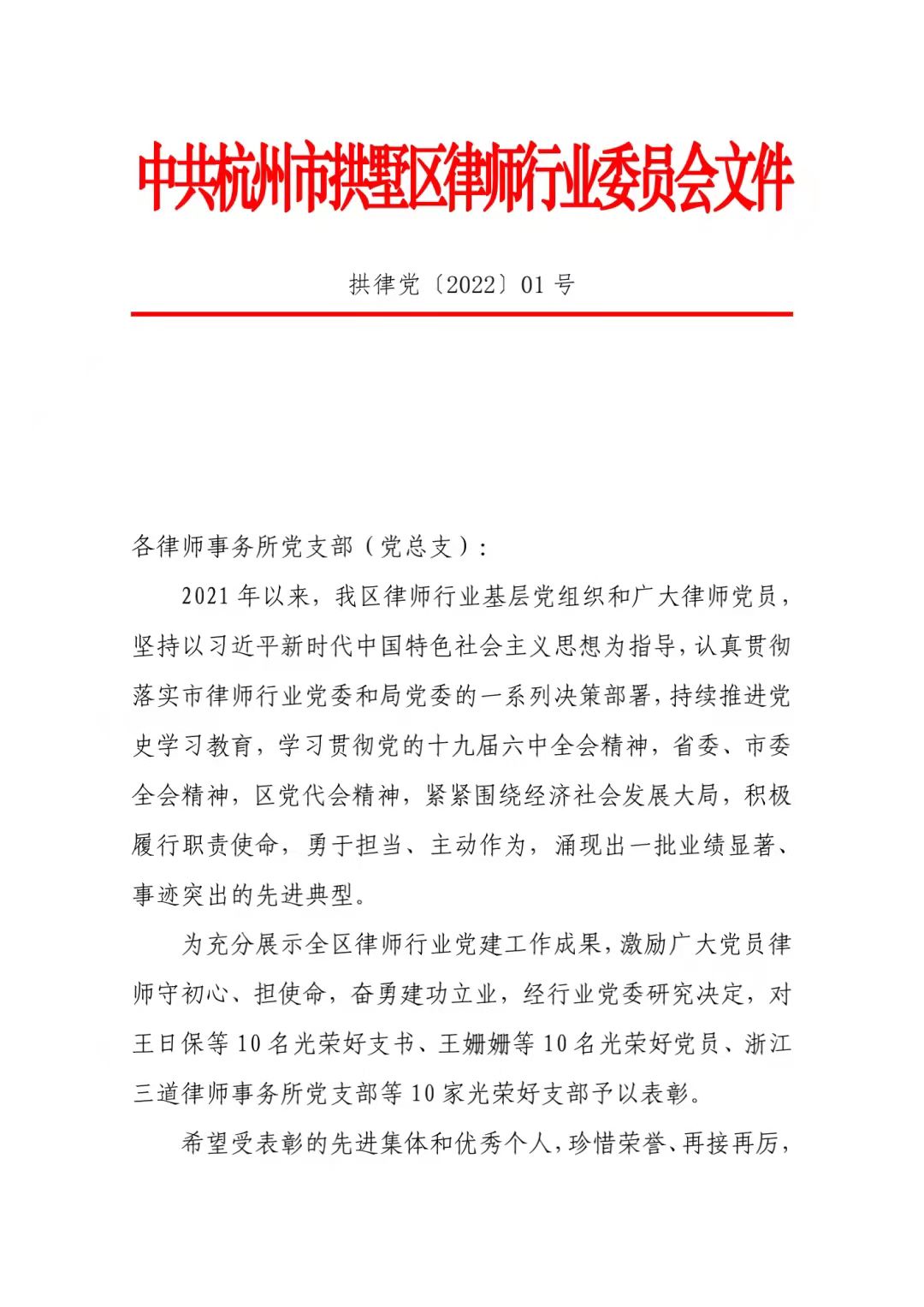 2022年1月18日,浙江宏昊律师事务所联合党支部被中共杭州市拱墅区律师行业委员会评为“光荣好支部”。
