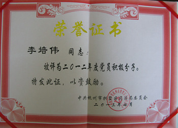 2013年7月12日下午,拱墅区司法局党委在区政府3号楼第五会议室召开“七一”律师党建表彰会议。我支部荣获“先进基层党组织”称号,支委宣传委员陈巧玲被评为“优秀党务工作者”,支部书记李培伟和党员朱虹被评为“党员积极分子”。