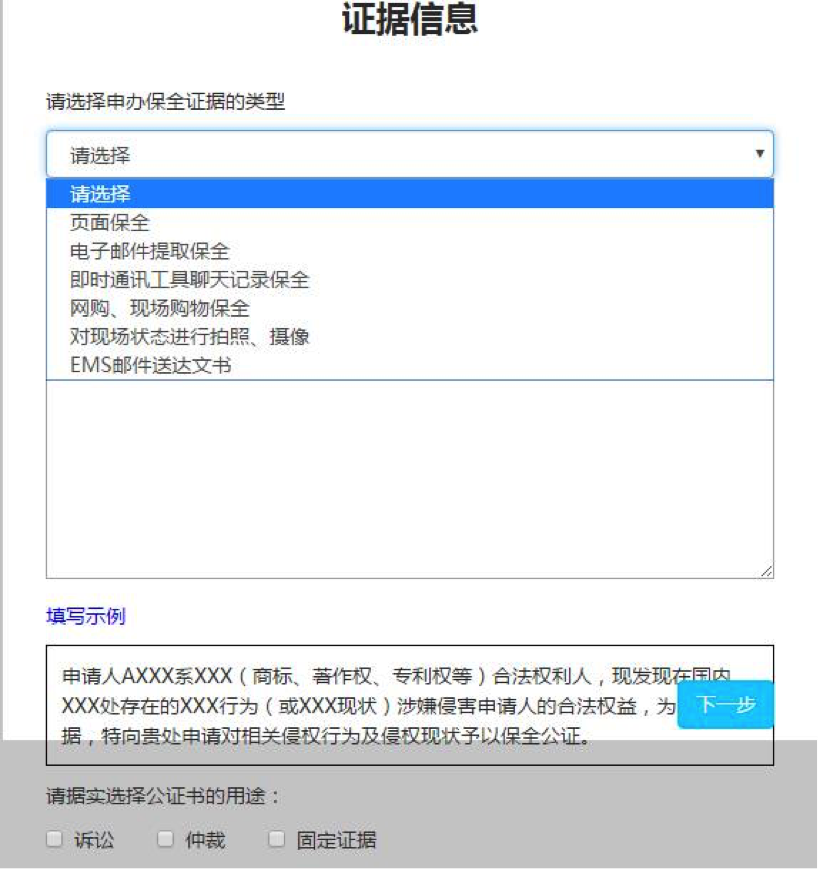 ② 点击“下一步”,选择申办保全证据的类型,按示例指引,填写办证原因,勾选公证书用途;