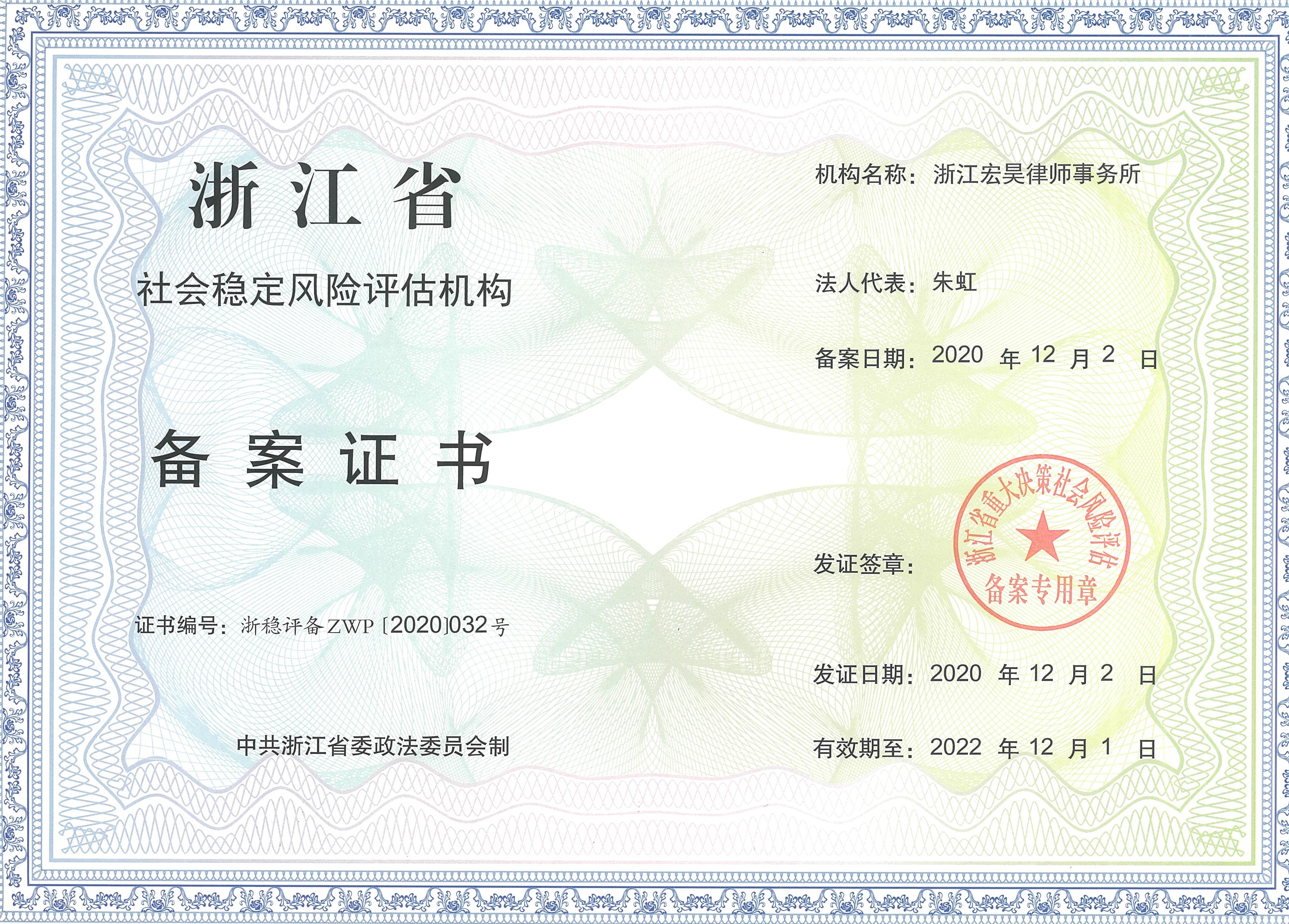 2020年12月,我所取得中共浙江省委政法委员会颁发的《浙江省社会稳定风险评估机构备案证书》,成功备案进入浙江省社会稳定风险评估机构名单。获得该证书后,我所可从事浙江省内的重大决策社会风险评估工作。(重大决策社会风险评估,简称社会风险评估,是指作出重大决策前,对决策事项存在的社会风险因素进行调查、识别、分析、研判和预防。)