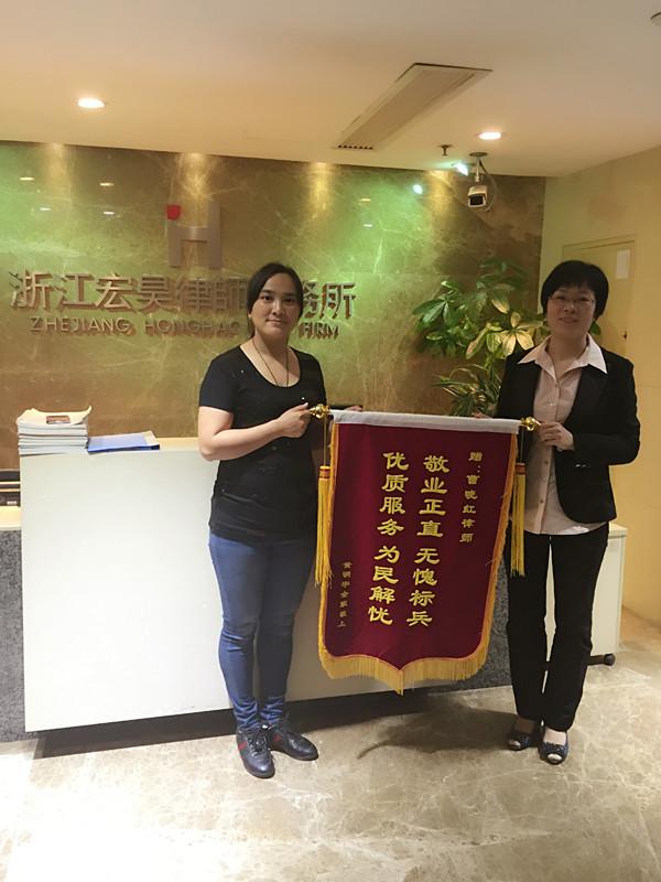 2015年10月19日上午,客户黄明宇来到浙江宏昊律师事务所,送来了一面写有“敬业正直、无愧标兵、优质服务、为民解忧”的锦旗,对宏昊所律师曹晓红一直以来给予的法律咨询及帮助,表示最诚挚的感谢。