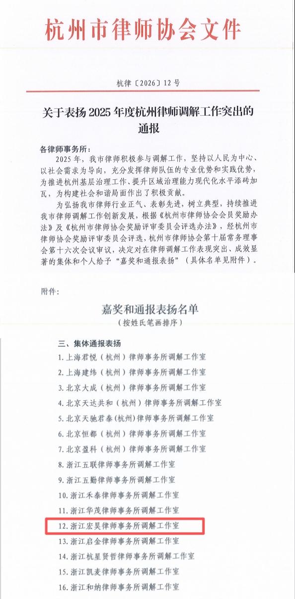 浙江宏昊律师事务所、浙江宏昊律师事务所调解工作室荣获“2025年度集体通报表扬”