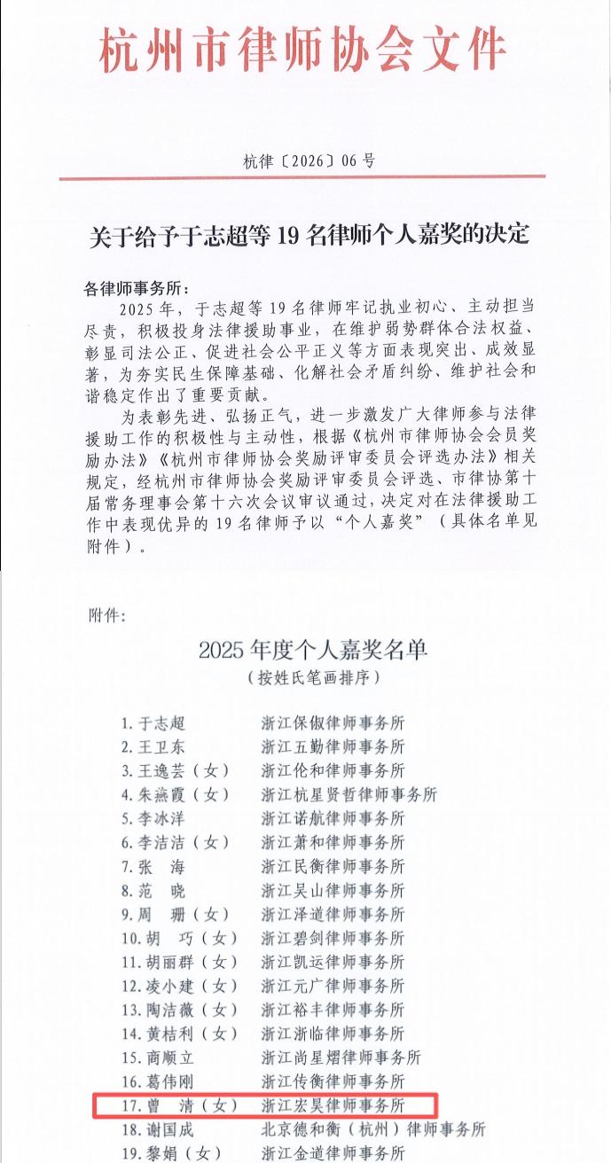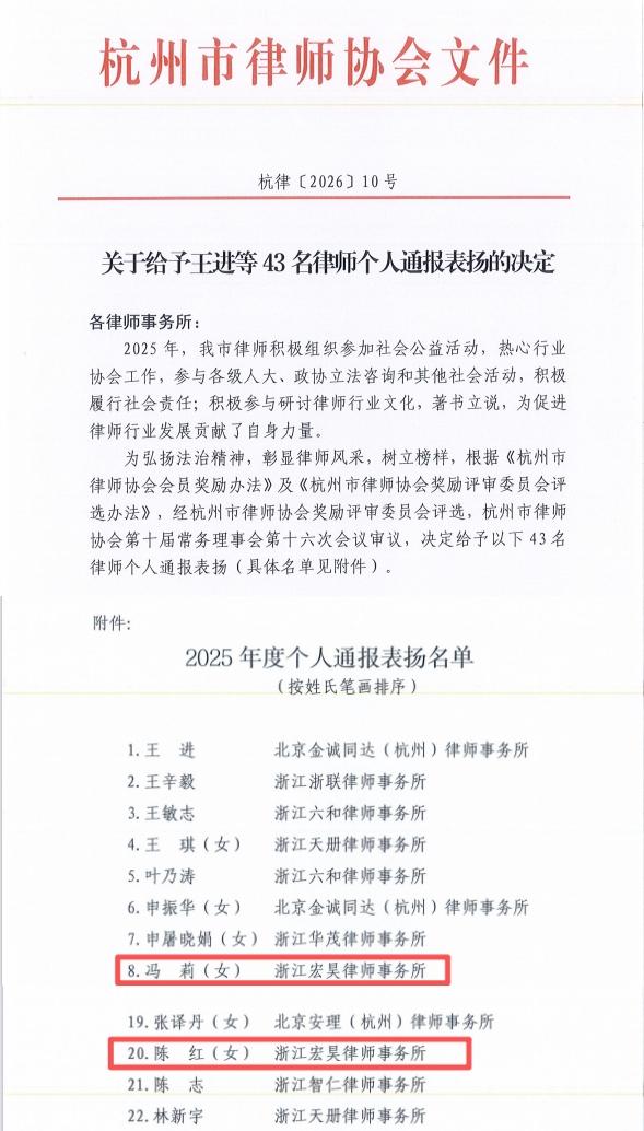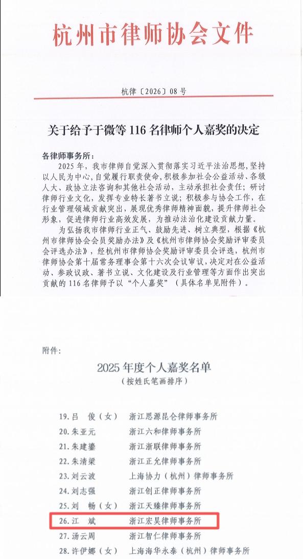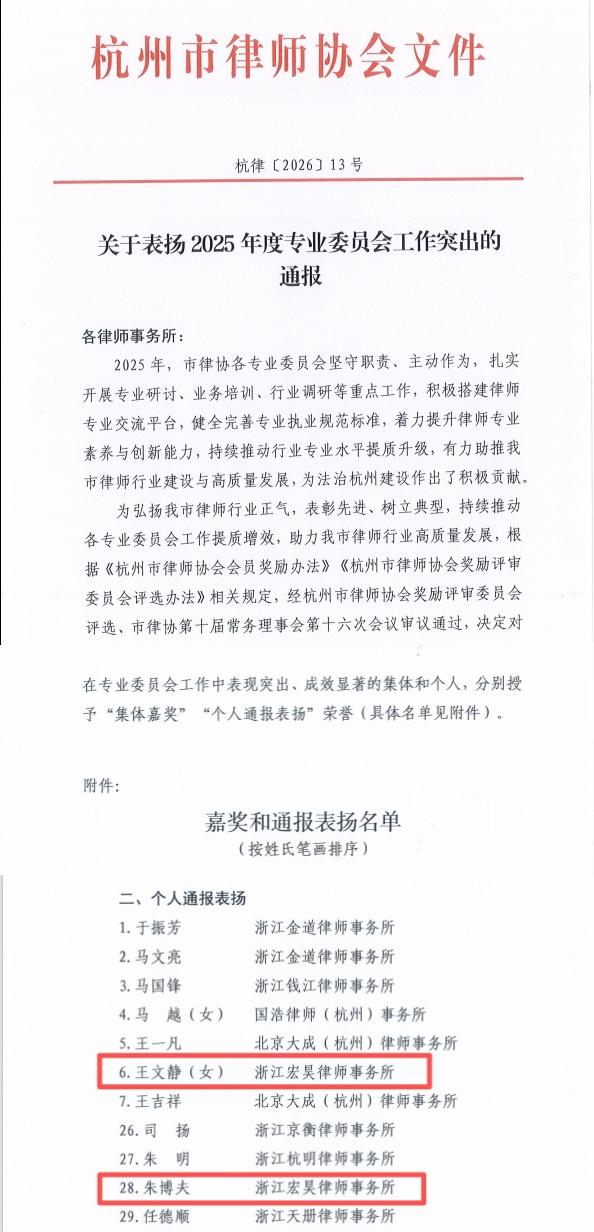 个人荣誉方面,多名律师脱颖而出、斩获佳绩:王文静律师荣获“2025年度杭州律师新星奖”;江斌、曾清律师荣获“2025年度个人嘉奖”;王文静、冯莉、朱博夫、陈红律师荣获“2025年度个人通报表扬”。这些获奖律师牢记执业初心、坚守法治信仰,在专业执业、公益服务、行业建设等不同领域履职尽责、表现突出,充分彰显了宏昊律师的专业素养与责任担当。